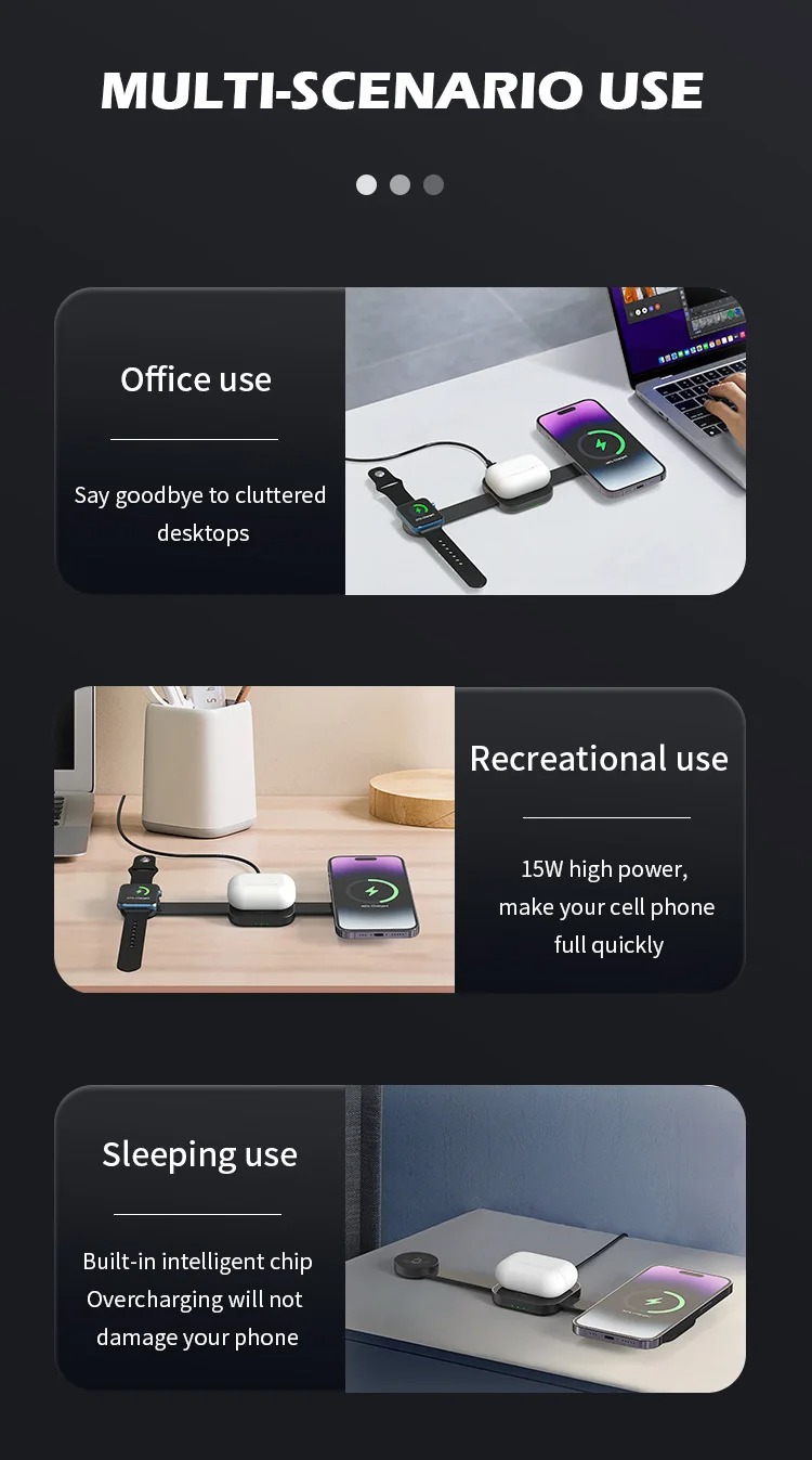 **MagFold Mini 3-in-1 Magnetic Wireless Charger** is the ultimate fast-charging solution for iPhone, earbuds, and smartwatches — all in one compact, foldable device.